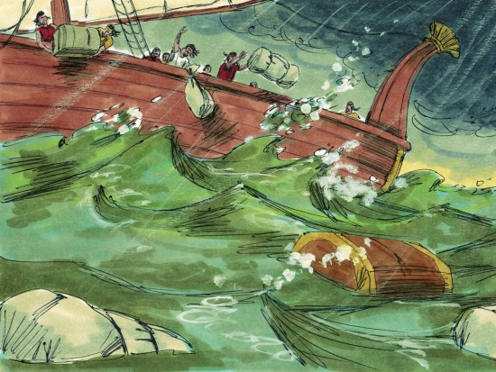 แต่พระเจ้าบันดาลให้เกิดลมพัดแรงในทะเล  และมันกลายเป็นพายุปั่นป่วนท้องทะเล ทำให้เรือเกือบจะแตกอยู่แล้ว   เหล่าลูกเรือต่างตกใจกลัว  ทุกคนเรียกร้องพระเจ้าของตน   พวกเขาช่วยกันเอาข้าวของ สินค้าโยนลงไปในทะเลเพื่อจะทำให้เรือเบาขึ้น